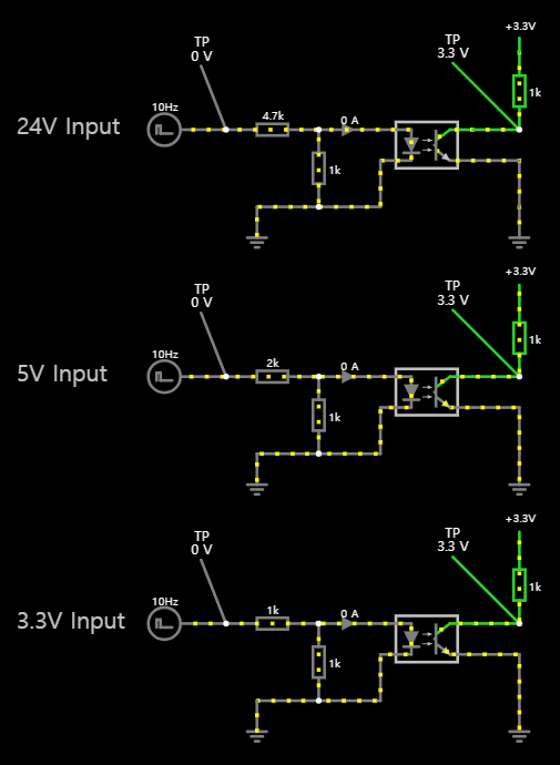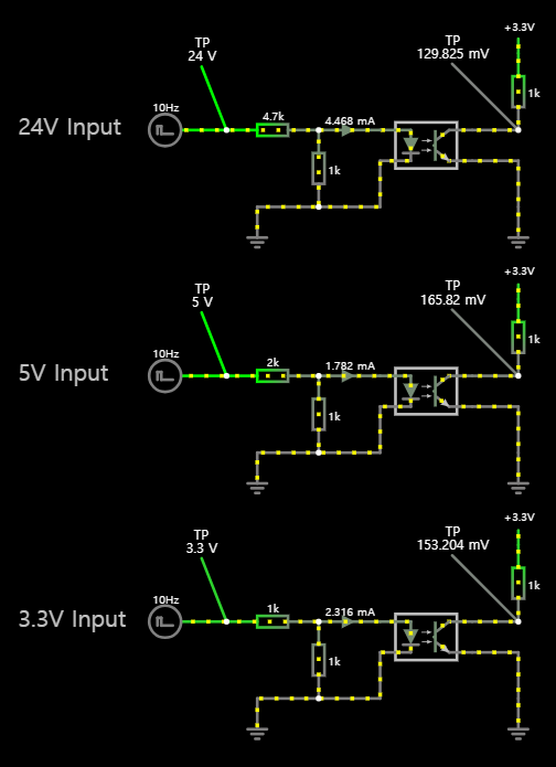 기존에는 포토커플러가 동작하지 않기 때문에 4번 핀은 3.3V로 연결될 것이다. 이후, 24V의 전원을 사용하여 Input 신호를 주게되면 4번->3번으로 전류가 흘러 Low(약 0V)로 나타난다.