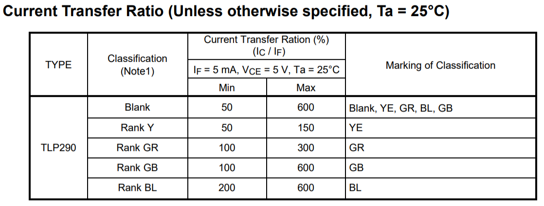 이 때, CTR의 등급을 나누는 Rank는 Datasheet를 참고하여 선정하기 바라며, 해당 부품에 표기되어 확인할 수 있다.