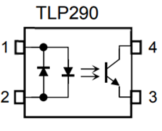 왼쪽의 다이오드는 발광 다이오드로 LED라고 생각하면된다. 오른쪽의 TR은 NPN형이며 LED를 통해 빛을 받으면 작동된다. 따라서 포토커플러는 LED를 사용하기 때문에 수명이 있어 오래 사용될 경우에는 이 부품을 사용하지 않는 것이 좋다.