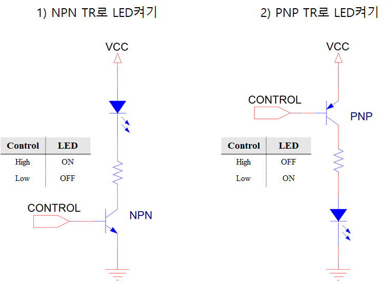 TR을 사용하지 않고 직접 LED를 ON/OFF할 수 있지만, MCU의 경우 LED의 역전류로 인해 손상을 입힐 수 있으니 TR을 함께 사용할 것을 추천한다.