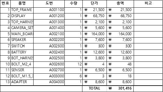 제품의 단가를 책정하기 위해 해당 문서에 부품의 단가를 작성하기도 한다.