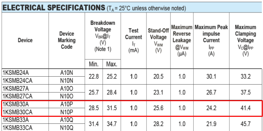 이 때, 사용할 TVS 다이오드(1KSMB30A)의 Spec.은, Vr = 25.6V, Vbr = 28.5V ~ 31.5V, Vc = 41.4V 이다.