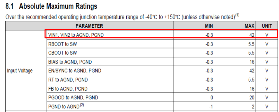 우선 아래 표는 LM61460의 Datasheet이다. 입력전압은 -0.3V~42V로 확인된다.