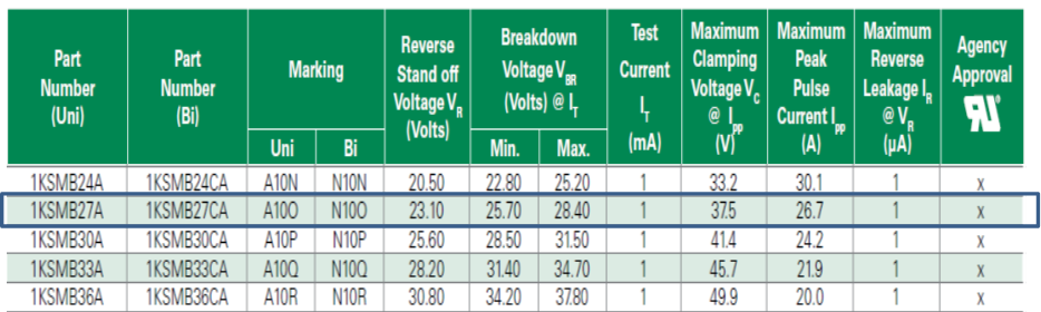 Littelfuse의 1KSMB27A 부품이 Shortage인 관계로 다른 제품을 확인해야한다.